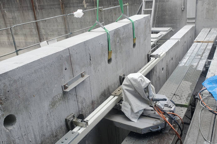 切断面に沿ってレールを固定し、その上を移動する特殊切断機(ダイヤモンドブレード)を高速回転させて、コンクリート構造物の床や壁といった平面・斜面の切断をする工法です。